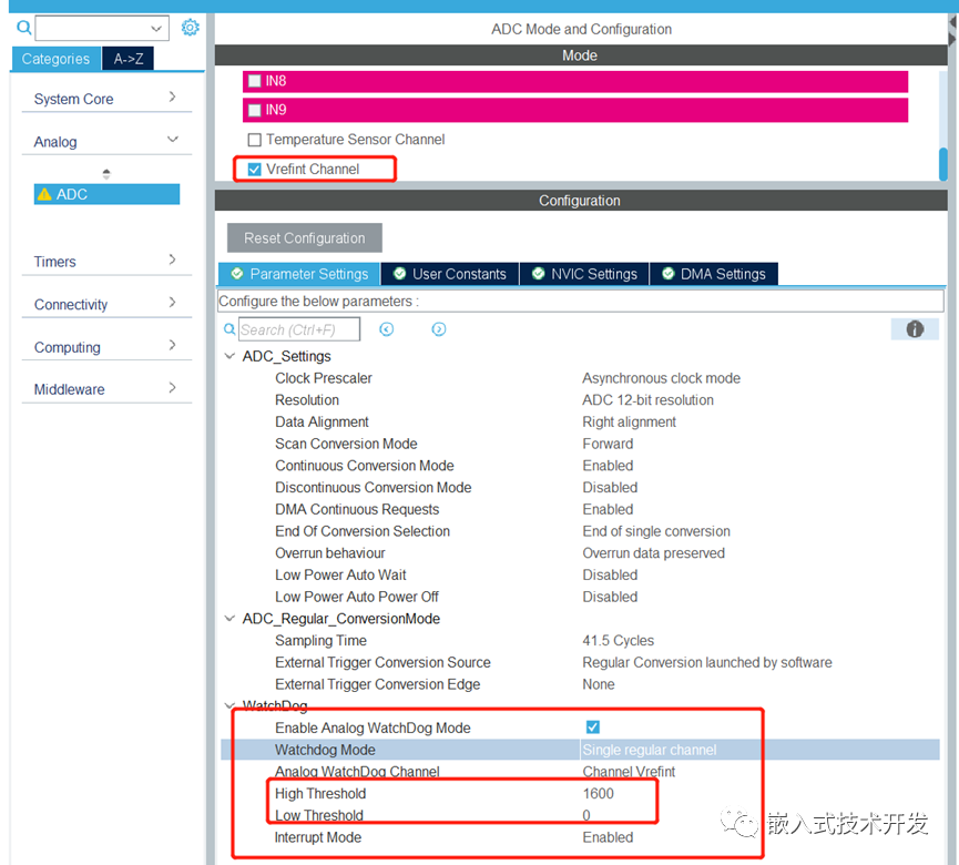 1.前言很多时候我们需要将程序中的一些参数、数据等存储在EEPROM或者Flash中,达到掉电保存的目的。但有些情况下,程序需要频繁的修改这些参数,如果每次修改参数都进行一次保存,那将大大降低存储器的寿命。尤其是单片机内部Flash,以STM32F030K6T6为例,擦写寿命只有1000次。当然,这是最小值,实际可能比这个多,但也是有风险。![]() 因此,最好的办法就是在程序运行中不进行保存操作,只在断电时保存一次。掉电保存的关键是怎样检测掉电瞬间,方法有很多种: 1.通过外部电路检测电源,触发IO中断。 2.通过单片机的PVD(可编程电压检测器) 中断检测。 3.通过ADC看门狗中断检测。 不管哪种方式,一般都是通过中断来实现,主要是为了快速响应。今天主要介绍第三种方式,通过ADC看门狗实现掉电保存。 2.1掉电时间 掉电保存的前提是断电后电源电压是缓慢下降的,这样才有足够的时间去检测掉电并保存数据。因此,电源上必须有个大电容,保证电源断开后能继续给单片机供电。具体需要维持多长时间,要看存储器的擦写周期。以STM32F030K6T6的内部存储器为例,擦除一页需要30ms,写入一个16位数据需要53.5us。根据实际需要擦除和写入的数据多少来计算至少需要多少时间。 还需要关注一个参数,编程电压。在用示波器测量掉电时的波形时,测量出从断电瞬间到电压降低到2.4V时的时间,该时间大于总的数据擦写的时间即可。当然要留有一定裕量。如果时间不够,就要加大电容了。 ![]() ADC检测掉电的方式有两种,一种是通过某个通道直接采集电源电压(或者分压后采集),另一种是采集内部参考电压Vrefint来判断电源电压。 第一种方式很好理解,采样值就代表电源电压,可以直接去触发ADC的看门狗中断。 第二种方式由于内部参考电压是不变的,STM32F030是1.23V,有一定误差。当电源电压变化时,ADC采集的参考电压会发生变化,因此也可以通过这个变化触发看门狗中断。这里有个前提,即单片机的VREF引脚或AVDD引脚就是要检测的电源电压。 ![]() 3.软件设计 首先打开STM32CubeMx,配置一下ADC,如下。 ![]()