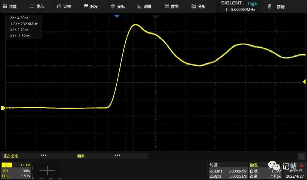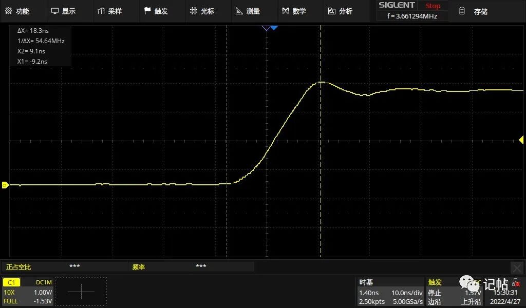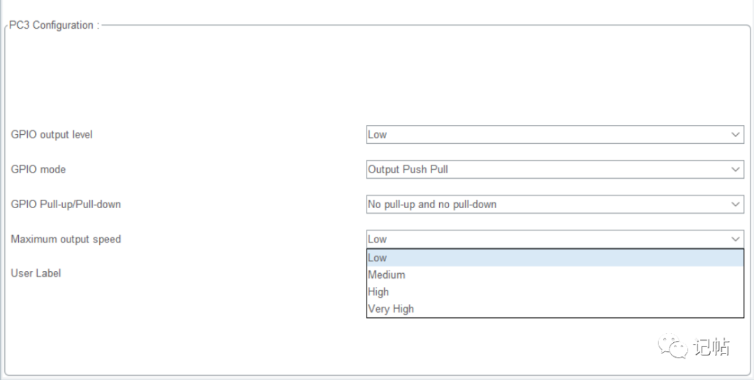 概述 本章主要GPIO输出模式下不同配置的说明。 使用STM32CUBEMX生成例程,这里使用NUCLEO-L476RG开发板,因为我这只有这款板子的主频较快。 ![]() 不同速率对应的波形 以PC3为例,在推挽输出无上下拉情况下,输出速率主要有4种,一般的低端MCU只有3种,没有Very High。 ![]() ![]() ![]() High速率 ![]() Very High速率 ![]() 可以看到,在不同速率下,端口的反应速度不一样,设置最大输出速率越大,响应越快,对应的噪声也就越大。 ![]() ![]() 在上图中,P-MOS带了一个⚪,说明是低电平导通。