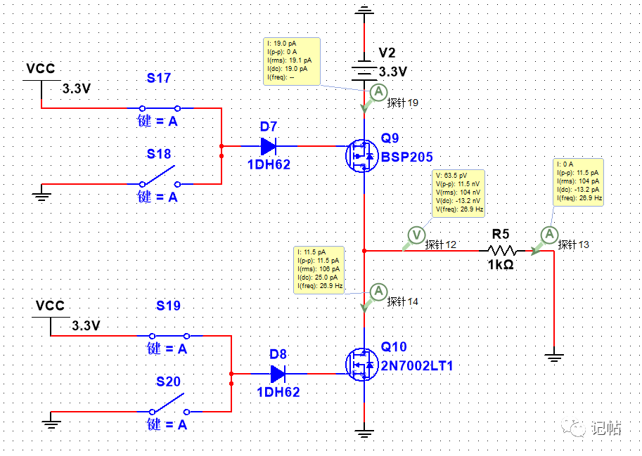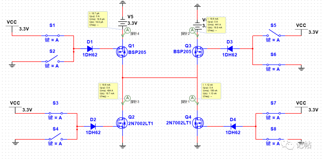 上图是GPIO的示意图,有输入和输出,如果简化为输出,则如下所示。 ![]() 推挽输出 推挽输出的内部电路大概是下图这个样子,由一个P-MOS和一个N-MOS组合而成,同一时间只有一个管子能够进行导通。 ![]() 当输出高电平时候,P-MOS导通,N-MOS截至,此时电源电流入R5。 ![]() 当输出低电平时候,N-MOS导通,P-MOS截至,此时电流流入R5的为0。 ![]() 线与 推挽输出高电平与电源电压基本上没有压差 高低电平的驱动能力较强,推挽输出的电流都能达到几十mA。 但是无法进行线与操作,做进行线与操作,那么电源和地就会短路,因为mos管电阻很小。 看下图可以得知,电流通过Q3的P-MOS流到Q2的N-MOS,最终回到地。 开漏输出又叫漏极开漏输出简化后可以看作如下的示意图。 ![]() 若还是使用上面推挽的电路图,当N-MOS为低电平时候,那么他的输出就是一个高阻态。 可以看到,R5没有电流通过,电压也是接近于0,所以GPIO无法对外输出高电平。 ![]() 此时需要增加一个上拉,这样的话上拉的电流就会流出去。 所以在开漏输出情况下,需要增加一个上拉才能进行输出高电平。 ![]() 对于输出低电平,他和推挽输出差不多,电流通过N-MOS流到地中。 ![]() 上图是没有增加上拉,但是开漏输出模式都需要增加,增加上拉之后如下图所示。 电流通过N-MOS流回地中。 ![]() 输出电压 由于推挽输出在输出的时候是通过单片机内部的电压,所以他的电压是不能改变的。 但是开漏输出是通过外部上拉的电压,所以可以改变开漏输出模式下的电压大小。 下图是当上拉为5V时候,也是可以驱动出去的,这个上拉电压最大值需要看单片机的耐压。 ![]() 转载自:记帖 如有侵权请联系删除 |