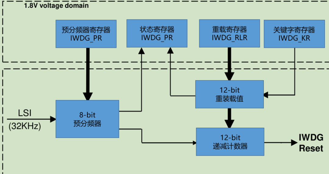 看门狗定时器(WDT,Watch Dog Timer)是单片机的一个组成部分,它实际上是一个计数器,一般来说都是向下计数的,给看门狗一个数字,程序开始运行后看门狗开始倒计数。如果程序运行正常,过一段时间CPU应发出指令让看门狗复位(在计数器减到0之前),重新开始倒计数。如果看门狗减到0就认为程序没有正常工作,强制整个系统复位。本节将对看门狗定时器的工作原理和作用进行详细讲解。 看门狗的主要功能是在发生系统软件故障时,将系统复位。也可以用于将系统从休眠或空闲模式唤醒。一般在嵌入式开发中,整个程序都是在次循环往复不停的工作,正常运行期间会定时让看门狗复位,一旦程序发生故障,停在某一处,看门狗不能及时复位,计数器减到0,就会强制整个系统复位,一般情况下复位操作能解决大部分问题。 用户开发的产品很有可能运用到一些非常极端苛刻的环境中,容易发生故障,但是通过复位就能解决,如果人工复位,成本相当高,这时候看门狗的使用就非常有效了。 ![]() STM32结合安全度、计时精确度和易用性提供了IWDG和WWDG两种看门狗,监测软件跑飞,或未按预想地运行的情况触发系统复位或产生中断(中断仅针对窗口看门狗) 独立看门狗IWDG:专用时钟LSI(内部低速时钟),低功耗模式仍可运行,对定时的控制比较松,由于专门为其提供独立的时钟,因此称为独立看门狗。 窗口看门狗WWDG:总线时钟APB1,对定时控制比较严,要求主应用程序在规定时间窗口内喂狗。 独立看门狗IWDG工作原理框图分析 ![]() 独立看门狗本质上就是一个计数定时器,既然是定时器,就和普通定时器的工作原理差不多,仍然包含计数器,重装载寄存器等关键部件。计数器递减的速度取决于时钟的频率,独立看门狗使用专用内部低速时钟,大小为32KHz。当计数器减到0后会触发一个复位异常,进行系统的重启。为了不让计数器减到0,在程序中每过一段时间都要进行喂狗操作,喂狗操作就是刷新递减计数器CNT的值,就是把重装载值再次刷进计数器中。状态寄存器是用来指示预分频器和重载寄存器更新的状态。 1.独立看门狗的时钟:STM32F4 的独立看门狗由内部专门的 32Khz 低速时钟(LSI)驱动,即使主时钟发生故障,它也仍然有效。这里需要注意独立看门狗的时钟是一个内部RC时钟(RC振荡器典型的缺陷就是比较容易受环境的影响,且精确地不高),所以并不是准确的32Khz,而是在 15~47Khz 之间的一个可变化的时钟,只是我们在估算的时候(之所以要估算时间是因为用户要确保计数器减到0 之前喂狗),以 32Khz 的频率来计算,看门狗对时间的要求不是很精确,所以,时钟有些偏差,都是可以接受的。 ![]() 2.预分频器:分频之后的时钟才是真正驱动递减计数器的时钟。寄存器中只有低3位有效,不同的位组合表示不同的分频系数。 ![]() 3.重载寄存器:低12位有效,最大值位2的12次方。只有在关键字寄存器中写入AAAAh时,重载寄存器厚葬的值才会自动装载到看门狗计数器中。 ![]() 4.关键字寄存器:用来控制独立看门狗,写入不同的值执行不同的命令。正常情况下PR和PLR是不可写的,具有写保护,需要通过写入关键字寄存器值来解除写保护。另外一旦通过关键字寄存器启动看门狗,看门狗计数,将不会再停止,除非硬件复位,默认情况下看门狗关闭,所以正常情况下不轻易使用看门狗,否则系统会产生出乎意料的复位,造成损失。 ![]() 5.状态寄存器:低2位有效,更新时一定要确定相应位为0才可以更新。 ![]() IWDG的超时时间 以预分频器分频系数为32为例,计数器的时钟频率为1KHz,每个脉宽的时间间隔为1ms,当计数器的值为最小值1时,则最短超时时间为1ms,当当计数器的值为最大值0xFFF时,最长超时时间为2的12次方乘以1ms为4096ms。因此用户可根据下表设置正确的超时时间防止看门狗复位。 ![]() IWDG独立看门狗实例 实验要求:开启STM32的独立看门狗,按键按下即喂狗,如果超时未喂狗,则看门狗复位系统,用指示灯指示系统复位。 步骤: 1.配置RCC ![]() ![]() 2.使能并配置IWDG ![]() 3.配置按键管脚为输入模式。 ![]() 4.编写代码