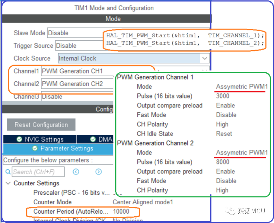 我先配置TIM1的CH1/CH2,实现2路带相差的PWM输出。【关于TIMER非对称PWM输出模式这里不介绍了,此处直接上配置。下面链接有相关文章介绍,或者自行研读STM32参考手册相关内容。】
