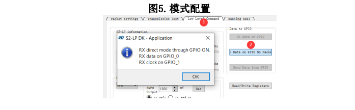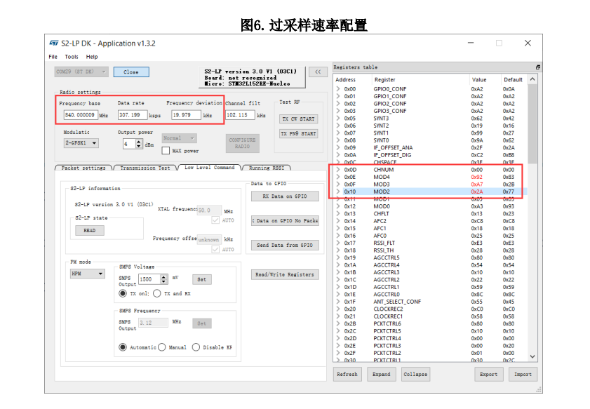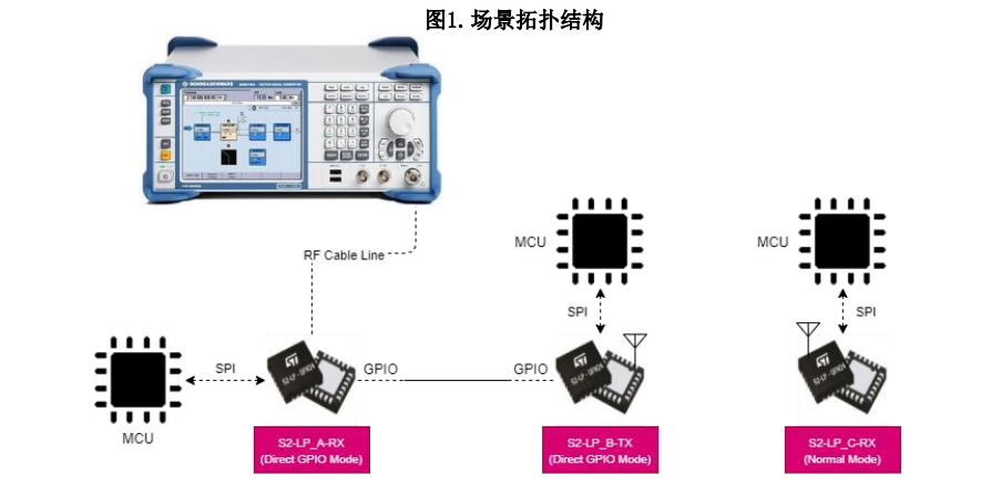1. 引言 在使用 Spirit 系列的 Sub1G 产品时,有一些特殊的场景,其数据来源于 GPIO 口,然后再将获取到的 GPIO 数据发送出去。当前 ST Spirit 系列支持以下三种数据模式: 1. 正常模式 2. 直接 FIFO 模式 3. 直接 GPIO 模式 其中,它们三者之间的区别如下:I. 正常模式 a) TX,有效的载荷包数据填充至 FIFO,当发送 TX 命令时,就会按照设置好的帧格式将数据发送出去 b) RX,对接收到的数据进行识别,当且仅当同步字匹配时,才会将数据填充至 FIFO 中 II. 直接 FIFO 模式 a) TX,用户需要自行拼装帧格式并填充至 FIFO,数据就会从 FIFO 中直接发送出去 b) RX,对接收到的数据不进行任何处理,直接填充至 FIFO 中,用户自行在应用 层中解析 III. 直接 GPIO 模式 1. TX,从 GPIO 口获取得到数据后不作任何处理,数据就直接被发送出去;同时 伴随一个时钟用于传送数据(上升沿有效) 2. RX,对接收到的数据不进行任何处理,直接通过 GPIO 输出;同时伴随一个时 钟用于接收数据(下降沿有效) 本文以直接 GPIO 模式为例,讲解如何利用 S2-LP_DK GUI 配置直接 GPIO 模式并互相 通信。 2. 应用场景 为了更好地阐述如何利用 S2-LP_DK GUI 配置直接 GPIO 模式,我们假设这样一个场 景: 设备 A 从信号发生器接收数据,然后通过 GPIO 口输出并作为设备 B 的数据源,而设 备 B 通过 GPIO 接收这些数据,然后直接发送出去,最后设备 C 接收设备 B 的数据并输出 Log 信息。这个场景的拓扑如下图 1 所示: ![]() 从上图可知,搭建这个场景需要如下设备: 1. 矢量信号发生器,R&S SMBV100A 2. FKI868V2 开发板 * 3 2.1 配置为了简化该场景的配置,这里采用默认的射频参数,即:1. 中心频点:868Mhz or 840Mhz 2. 通讯速率:38.4Ksps 3. 频率偏差:20Khz 4. 接收带宽:100Khz 5. 调制方式:2GFSK-1 以及帧格式如下图 2 所示: ![]() 2.1.1 矢量信号发生器这里仅需要根据上述的配置中提及的参数设置即可,详情如下图 3 所示: ![]() 2.1.2. 设备 A 同理,设备 A 想要从矢量信号发生器获取数据,对应的射频参数就要设置成一样,如下图 4 所示: ![]() 配置完上述的参数之后,在 Low Level Command 选项中点击 Data on GPIO no Packet,即可让设备 A 进入直接 GPIO 接收模式,如下图 5 所示: ![]() 2.1.3. 设备 B 由于设备 A 与设备 B 之间的时钟是不同步的,所以为了获取设备 A 的数据,设备 B 应该采用过采样的方式,即设备 B 的通讯速率应该至少等于设备 A 的 8 倍,也就是 38.4 * 8 = 307.2Ksps。但是,目前 GUI 最大只能设置 250Ksps 的速率,所以设备 B 想要配置通讯速率为 307.2Ksps,需要手动修改寄存器;具体如下图 6 所示: ![]() 因为设备 B 此时是作为 TX 端,因此不需要配置接收带宽参数;同时为了避免引起歧义,将中心频点变更为 840Mhz。最后,在 Low Level Command 选项中点击 Send Data from GPIO,即可让设备 B 进入直接 GPIO 发射模式,如下图 7 所示: ![]() 2.1.4. 设备 C 设备 C 是通过天线接收设备 B 传送过来的数据,所以中心频点应该跟设备 B 一样,其他的数跟设备 A 一样,详情如下图 8 所示: ![]() 而帧格式的配置应保持与上述配置中提及的相同。至此,所有的设备配置均已完成,最终的实物搭建如下图 9 所示: ![]() 3. 实验结果 下图 10 展示了基于直接 GPIO 模式的设备 B,接收到从设备 A 传送过来的 GPIO 口数据,并通过天线发送给设备 C 并显示出来。 ![]() 如有侵权请联系删除 |