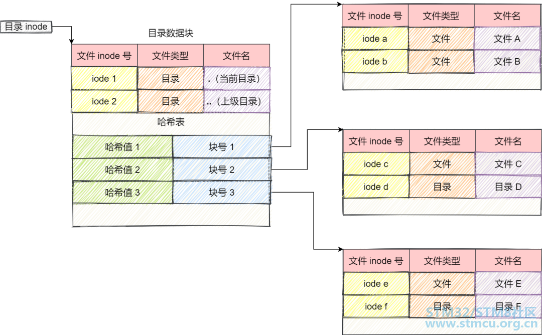 不过,Ext2 的后续版本采用了稀疏技术。该做法是,超级块和块组描述符表不再存储到文件系统的每个块组中,而是只写入到块组 0、块组 1 和其他 ID 可以表示为 3、 5、7 的幂的块组中。 目录的存储 在前面,我们知道了一个普通文件是如何存储的,但还有一个特殊的文件,经常用到的目录,它是如何保存的呢? 基于 Linux 一切皆文件的设计思想,目录其实也是个文件,你甚至可以通过 vim 打开它,它也有 inode,inode 里面也是指向一些块。 和普通文件不同的是,普通文件的块里面保存的是文件数据,而目录文件的块里面保存的是目录里面一项一项的文件信息。 在目录文件的块中,最简单的保存格式就是列表,就是一项一项地将目录下的文件信息(如文件名、文件 inode、文件类型等)列在表里。 列表中每一项就代表该目录下的文件的文件名和对应的 inode,通过这个 inode,就可以找到真正的文件。