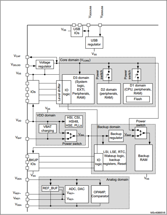 14.1 初学者重要提示 1、 电源管理部分涉及到的各种低功耗方式会在后面章节中为大家讲解,当前阶段仅需了解低功耗属于电源管理部分即可。 2、 电源管理部分最繁琐的就是CPU,D1,D2,D3域的各种运行,待机,停机状态切换,这部分知识点也放在后面低功耗章节学习。 14.2 电源 电源是系统稳定运行的根本,主要分为以下几个知识点,电源供电、供电监控、电源管理和低功耗。当前阶段主要了解电源供电和硬件上电时序。 14.2.1 电源供电 学习STM32H7的电源供电,往往被一堆电源标识Vdd,Vdda,Vcap,Vss等搞迷糊,这些标识整明白了,电源供电部分也就理解了,首先看下面的框图: