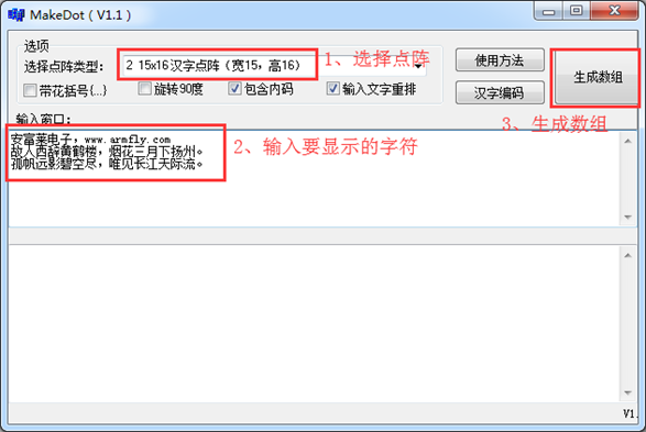 选择16点阵,并将要显示的字符复制到输入窗口: