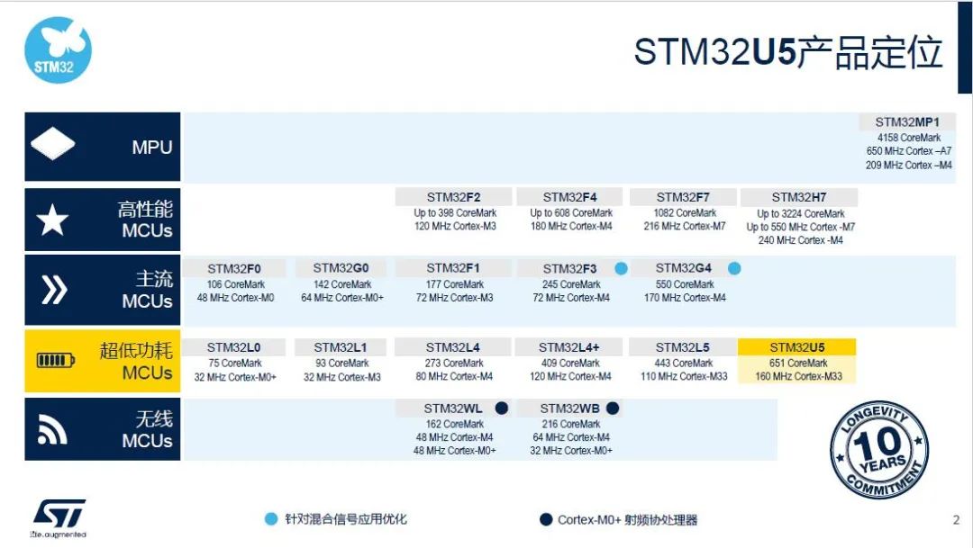 STM32U5,采用全新工艺制程 意法半导体中国区微控制器产品市场经理彭祖年介绍,STM32U5基于Arm Cortex-M33内核,这是继第一款基于Cortex-M33内核的STM32L5后,ST开发的第二款基于此内核的MCU产品。虽然同属于低功耗系列MCU,但是STM32U5并没有延续工程师早已熟悉的“L”命名,而是采用全新的“U”来命名,主要因为STM32U5并非只是STM32L5的简单升级,而是有一个质的飞跃。STM32U5采用全新的40nm制造技术,这是一个适用于MCU的先进制程,可以大幅节省动态工作模式下的功耗。 彭祖年介绍,STM32U5主要满足可穿戴、个人医疗、家庭自动化和工业传感器等对功耗敏感的智能应用设备。 STM32U5,低功耗与高性能其实可以不冲突 迄今为止,STM32超低功耗MCU出货量已经超过20亿,ST已经凭借丰富的低功耗技术储备和对低功耗市场的专注,在超低功耗MCU领域具有强大的优势。彭祖年介绍,这款精心打磨的STM32U5更是在降低功耗方面做足了功课:①采用全新工艺制程,从硬件层面降低功耗。②低功耗后台自主模式,通俗解释就是早期设计的芯片进入低功耗休眠模式后,MCU要断电,但是芯片外围还有很多传感器在不断采集并传输数据,需要不断唤醒MCU处理数据,而STM32U5中有一个非常巧妙的外设,设置了一个16KB的SRAM4来存储传感器发送过来的数据,等数据累积到一定的量时(具体多少,客户可以根据应用需求设定),唤醒MCU集中处理,这样避免了MCU被频繁唤醒,从而使休眠功耗降低到原来的十分之一。③更多功耗模式和省电小技巧,STM32U5有多种工作模式满足不同场景下的应用需求。STM32U5采用根据工作负荷优化能耗的动态电压调节和高效读取闪存的ST ART Accelerator访存加速技术。此外,STM32U5集成了一个先进的DC/DC电压动态转换器和低压降(LDO)稳压器,系统可以灵活选择内核供电方式,从而将STM32U5动态功耗降低到19μA/MHz以下。