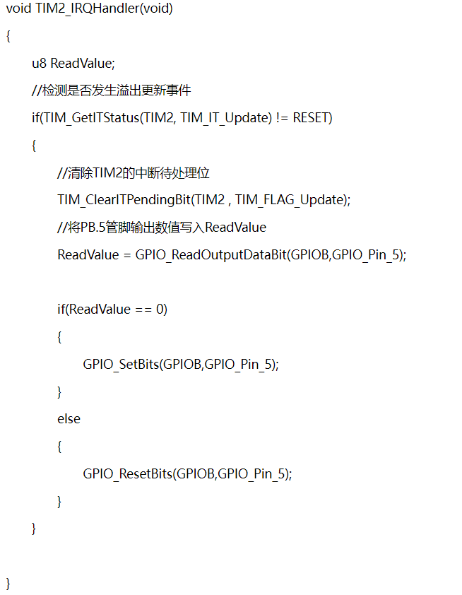 数字滤波器(ETR,TIx)是为了将ETR进来的分频后的信号滤波,保证通过信号频率不超过某个限定。 步骤(7)中需要禁止使用预装载缓冲器。当预装载缓冲器被禁止时,写入自动装入的值(TIMx_ARR)的数值会直接传送到对应的影子寄存器;如果使能预加载寄存器,则写入ARR的数值会在更新事件时,才会从预加载寄存器传送到对应的影子寄存器。 ARM中,有的逻辑寄存器在物理上对应2个寄存器,一个是程序员可以写入或读出的寄存器,称为preload register(预装载寄存器),另一个是程序员看不见的、但在操作中真正起作用的寄存器,称为shadow register(影子寄存器);设计preload register和shadow register的好处是,所有真正需要起作用的寄存器(shadow register)可以在同一个时间(发生更新事件时)被更新为所对应的preload register的内容,这样可以保证多个通道的操作能够准确地同步。如果没有shadow register,或者preload register和shadow register是直通的,即软件更新preload register时,同时更新了shadow register,因为软件不可能在一个相同的时刻同时更新多个寄存器,结果造成多个通道的时序不能同步,如果再加上其它因素(例如中断),多个通道的时序关系有可能是不可预知的。 3. 程序源代码 本例实现的是通过TIM2的定时功能,使得LED灯按照1s的时间间隔来闪烁 #include "stm32f10x_lib.h" void RCC_cfg(); void TIMER_cfg(); void NVIC_cfg(); void GPIO_cfg(); int main() { RCC_cfg(); NVIC_cfg(); GPIO_cfg(); TIMER_cfg(); //开启定时器2 TIM_Cmd(TIM2,ENABLE); while(1); } void RCC_cfg() { //定义错误状态变量 ErrorStatus HSEStartUpStatus; //将RCC寄存器重新设置为默认值 RCC_DeInit(); //打开外部高速时钟晶振 RCC_HSEConfig(RCC_HSE_ON); //等待外部高速时钟晶振工作 HSEStartUpStatus = RCC_WaitForHSEStartUp(); if(HSEStartUpStatus == SUCCESS) { //设置AHB时钟(HCLK)为系统时钟 RCC_HCLKConfig(RCC_SYSCLK_Div1); //设置高速AHB时钟(APB2)为HCLK时钟 RCC_PCLK2Config(RCC_HCLK_Div1); //设置低速AHB时钟(APB1)为HCLK的2分频 RCC_PCLK1Config(RCC_HCLK_Div2); //设置FLASH代码延时 FLASH_SetLatency(FLASH_Latency_2); //使能预取指缓存 FLASH_PrefetchBufferCmd(FLASH_PrefetchBuffer_Enable); //设置PLL时钟,为HSE的9倍频 8MHz * 9 = 72MHz RCC_PLLConfig(RCC_PLLSource_HSE_Div1, RCC_PLLMul_9); //使能PLL RCC_PLLCmd(ENABLE); //等待PLL准备就绪 while(RCC_GetFlagStatus(RCC_FLAG_PLLRDY) == RESET); //设置PLL为系统时钟源 RCC_SYSCLKConfig(RCC_SYSCLKSource_PLLCLK); //判断PLL是否是系统时钟 while(RCC_GetSYSCLKSource() != 0x08); } //允许TIM2的时钟 RCC_APB1PeriphClockCmd(RCC_APB1Periph_TIM2,ENABLE); //允许GPIO的时钟 RCC_APB2PeriphClockCmd(RCC_APB2Periph_GPIOB,ENABLE); } void TIMER_cfg() { TIM_TimeBaseInitTypeDef TIM_TimeBaseStructure; //重新将Timer设置为缺省值 TIM_DeInit(TIM2); //采用内部时钟给TIM2提供时钟源 TIM_InternalClockConfig(TIM2); //预分频系数为36000-1,这样计数器时钟为72MHz/36000 = 2kHz TIM_TimeBaseStructure.TIM_Prescaler = 36000 - 1; //设置时钟分割 TIM_TimeBaseStructure.TIM_ClockDivision = TIM_CKD_DIV1; //设置计数器模式为向上计数模式 TIM_TimeBaseStructure.TIM_CounterMode = TIM_CounterMode_Up; //设置计数溢出大小,每计2000个数就产生一个更新事件 TIM_TimeBaseStructure.TIM_Period = 2000 - 1; //将配置应用到TIM2中 TIM_TimeBaseInit(TIM2,&TIM_TimeBaseStructure); //清除溢出中断标志 TIM_ClearFlag(TIM2, TIM_FLAG_Update); //禁止ARR预装载缓冲器 TIM_ARRPreloadConfig(TIM2, DISABLE); //开启TIM2的中断 TIM_ITConfig(TIM2,TIM_IT_Update,ENABLE); } void NVIC_cfg() { NVIC_InitTypeDef NVIC_InitStructure; //选择中断分组1 NVIC_PriorityGroupConfig(NVIC_PriorityGroup_1); //选择TIM2的中断通道 NVIC_InitStructure.NVIC_IRQChannel = TIM2_IRQChannel; //抢占式中断优先级设置为0 NVIC_InitStructure.NVIC_IRQChannelPreemptionPriority = 0; //响应式中断优先级设置为0 NVIC_InitStructure.NVIC_IRQChannelSubPriority = 0; //使能中断 NVIC_InitStructure.NVIC_IRQChannelCmd = ENABLE; NVIC_Init(&NVIC_InitStructure); } void GPIO_cfg() { GPIO_InitTypeDef GPIO_InitStructure; GPIO_InitStructure.GPIO_Pin = GPIO_Pin_5; //选择引脚5 GPIO_InitStructure.GPIO_Speed = GPIO_Speed_50MHz; //输出频率最大50MHz GPIO_InitStructure.GPIO_Mode = GPIO_Mode_Out_PP; //带上拉电阻输出 GPIO_Init(GPIOB,&GPIO_InitStructure); } 在stm32f10x_it.c中,我们找到函数TIM2_IRQHandler(),并向其中添加代码 void TIM2_IRQHandler(void) { u8 ReadValue; //检测是否发生溢出更新事件 if(TIM_GetITStatus(TIM2, TIM_IT_Update) != RESET) { //清除TIM2的中断待处理位 TIM_ClearITPendingBit(TIM2 , TIM_FLAG_Update); //将PB.5管脚输出数值写入ReadValue ReadValue = GPIO_ReadOutputDataBit(GPIOB,GPIO_Pin_5); if(ReadValue == 0) { GPIO_SetBits(GPIOB,GPIO_Pin_5); } else { GPIO_ResetBits(GPIOB,GPIO_Pin_5); } } } |