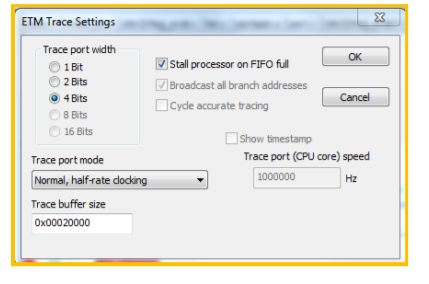 一. STM32 调试特性简介 STM32 的 CPU 采用的是 Cortex-M 系列的内核(M3 或 M4),CM3 和 CM4 的调试技能较之普通的单片机有了质的飞跃。一般情况下,CM3 的调试功能可被分为两类, 1. 侵入式调试 停机以及单步执行程序 硬件断点 断点指令(BKPT) 数据观察点,作用于单一地址、一个范围的地址,以及数据大的值 访问寄存器的值 调试监视器异常 2. 非侵入式调试 在内核运行的时候访问存储器 指令跟踪,需要通过可选的嵌入式跟踪宏单元(ETM) 通常情况下,我们采用的是侵入式调试,这种调试会打破程序的全速运行。非侵入式调试则可以再保证在程序全速运行的情况下,了解程序运行的情况,当调试大型软件和多任务系统时,非侵入式调试有着不可比拟的作用。 二. IAR 下使用 J-Trace 进行指令跟踪 1. 使能 ETM 接口 两种方法,文件见附件: 通用方法在初始化代码中添加