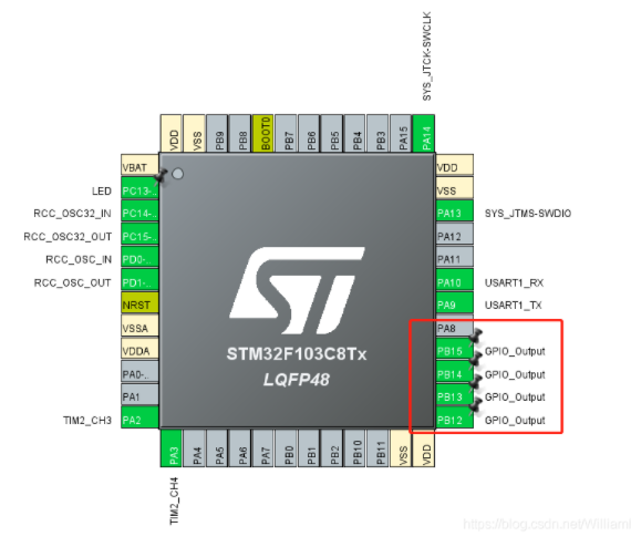 4.在右侧界面的芯片中分别点击 PB12、PB13、PB14、PB15,并将其配置为 GPIO_Output。
