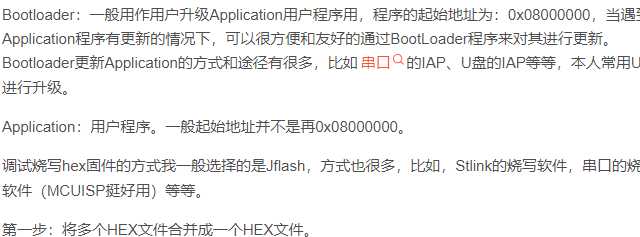 为满足日常开发需求,现在很多情况下一个片子需要通过BootLoader和Application两段程序组成。 Bootloader:一般用作用户升级Application用户程序用,程序的起始地址为:0x08000000,当遇到Application程序有更新的情况下,可以很方便和友好的通过BootLoader程序来对其进行更新。Bootloader更新Application的方式和途径有很多,比如串口的IAP、U盘的IAP等等,本人常用U盘进行升级。 Application:用户程序。一般起始地址并不是再0x08000000。 调试烧写hex固件的方式我一般选择的是Jflash,方式也很多,比如,Stlink的烧写软件,串口的烧写软件(MCUISP挺好用)等等。 第一步:将多个HEX文件合并成一个HEX文件。 这里以两个HEX为例,其中一个为BootLoader,另一个为Application。 1.新建一个文本文档,并命名成XXX.hex 2.通过各种编辑器分别打开BootLoader.hex、Application.hex和XXX.hex。我这里用的是notepad++。 3.把Bootloader里面的内容全部复制到XXX.hex中 4.删除XXX.hex中的最后一行(:00000001FF) 5.将Application.hex中的内容全部复制并添加到XXX.hex的结尾 6.保存,此时的XXX.hex文件就是一个合并了Bootloader和Application的固件。 第二步:烧写固件 烧写固件比较简单,但是要注意两个hex的文件要确保烧写的地址。 |