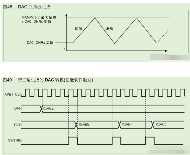 注意: 为了产生三角波,必须使能 DAC 触发,即设 DAC_CR 寄存器的 TENx 位为 ’1’ 。 MAMP[3:0] 位必须在使能 DAC 之前设置,否则其值不能修改 下面通过代码来设置DAC输出三角波