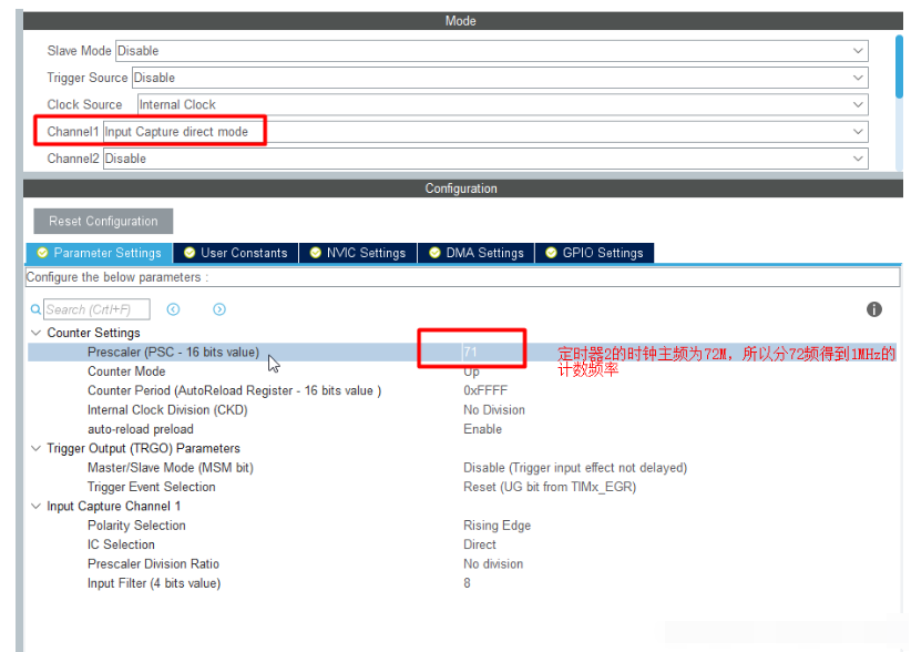 - TIM2_SetCapturePolarity(TIM_INPUTCHANNELPOLARITY_RISING); // 设置为上升沿触发