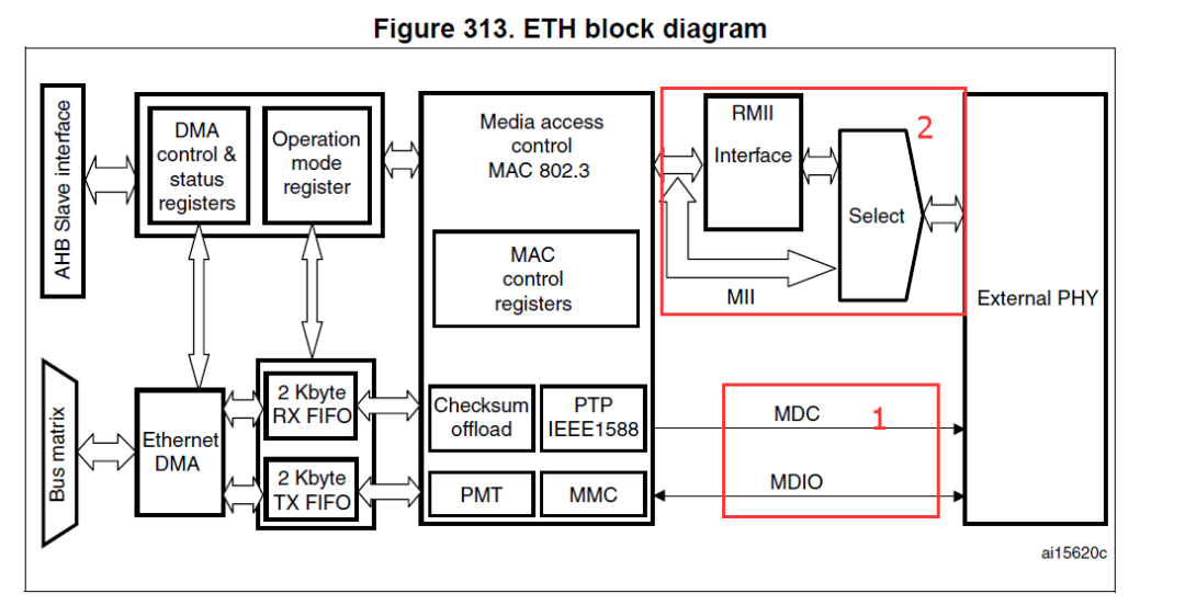 这是因为,将HSE的OSC部分滤除掉,通过HSE的bypass,已经将50MHz的时钟通过OSCIN输入到PLL,再通过PLL产生提供内核和外设的时钟。 2.3、需要强力PHY 这个方案也使用一个25MHz的晶振,但是需要一个功能强大的PHY芯片,这颗PHY可以将输入的25MHz的时钟内部倍频到50MHz时钟,然后输出给STM32的MAC控制模块。 外接25MHz晶振,内部的PLL配置HCLK,提供给内核和外设等。 STM32通过MCO引脚提供25MHz时钟给外部PHY。 外部PHY内部生成50MHz的时钟提供给STM32的MAC控制模块。 此方案适合STM32F107/2x7/4x7。 个人不建议这种方案,不利于后期更换物料。