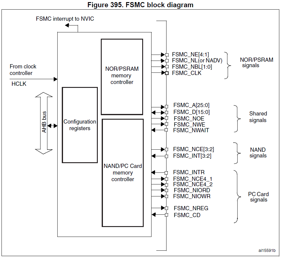 △FSMC框图示意 02、AHB接口 AHB设备接口可以使内部CPU和其他主总线外设去访问外部存储器。AHB事务可以传输外部设备协议。特别是当外部存储器被选择位8位或16位,32位的AHB传输传输事务会被划分为多个连续的8位或16的传输事务。片选会在每次访问时切换。 通用事务规则要求AHB传输数据宽度必须是8位、16位或32位。但是访问外部数据必须有个固定的数据宽度。这可能导致不一样的传输。 因此必须遵循一些简单的事务规则: AHB事务数据宽度必须和存储器数据宽度相同。在这种情况下不会出问题; AHB事务数据宽度大于存储器数据宽度,在这种情况下,FSMC会将AHB事务分为多个连续的存储器访问,这样符合外部存储器访问数据宽度; AHB事务数据小存储器宽度,在这种情况下,异步传输可能一致,也可能不一致,这取决于外部设备的类型。 对设备的异步访问要具有字节选择功能(SRAM,ROM,PSRAM),①FSMC 允许写入事务通过其字节选择通道 NBL[1:0] 访问恰当的数据,②允许读取事务。会读取所有存储器字节,并将丢弃无用的存储器字节。 NBL[1:0]在读取事务期间保持为低电平。 对不具有字节选择功能的器件( 16 位 NOR 和 NAND Flash)进行异步访问,当请求对 16 位宽的 Flash 存储器进行字节访问时会发生此情形。 显然,不能在字节模式下访问此器件(只能针对 Flash 存储器读取或写入 16 位字),因此①不允许写入事务,②允许读取事务。会读取所有存储器字节,并将丢弃无用的存储器字节。 NBL[1:0]在读取事务期间保持低电平。 03、外部设备地址映射 FSMC的外部设备地址映像,STM32的FSMC将外部存储器划分为固定大小为256M字节的四个存储块: 块1被用于4个NORflash或者PSRAM内存设备。块1被划分为4块NORflash/PSRAM带有独立的片选信号。 块2和块3用于连接NANDflash(一个块驱动一个设备) 块4用于连接PC块设备 对于每个存储区域,所要使用的存储器类型由用户在配置寄存器中定义
