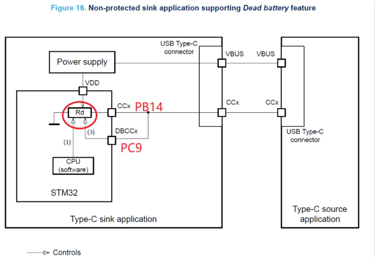 0 1 问题现象 客户反馈,使用STM32H523RET6应用中配置了两个IO口,PC9为输出模式,内部下拉;PB14为输入模式,内部上拉。在程序中将PC9引脚输出高电平,结果观察到PB14的电平被拉低。 ▲ 图 1 PC9输出低时,PB14为高 ▲ 图2 PC9输出高时,PB14被拉低 0 2 问题重现 使用NUCLEO-H533RE板,新建一个cubemx工程(cubemx版本:v6.13.0),按客户问题所述配置PC9和PB14,然后在代码中驱动PC9输出高,结果很容易就重现了问题。 0 3 问题分析 一般来说,在ST官方DEMO板上很容易重现,就意味着问题能很快解决或者很可能是芯片就是如此设计的。于是查找相关文档,注意到PC9可复用为UCPD1_DBCC2引脚,而PB14则可复用为UCPD1_CC2引脚。STM32H5默认时UCPD外设的DB(Dead Battery)功能是激活的,而这个DB特性刚好会影响正常的GPIO功能,这个在AN2552 Rev7文档中的第11.3.1节有相关描述: 在DBCCx引脚(PC9)上检测到电压超过1V时,则芯片内的Rd电阻激活,进而将CCx引脚(PB14)拉低。 也许有人会问,我啥也没做啊,我也没用到UCPD外设,我的电路图也根本不是图上这么设计的,芯片怎么会这样? 这就得回到USB Type-C接口的PD功能来说了。USB Type-C口大体上来说数据可分为三个通路:USB3.x数据通路,USB2.0数据通路,以及走CC线的PD协议,当然还有VBUS上的电力供应。 CC线上的PD协议正是用于SOURCE端和SINK端之间进行电力协商的,经典的应用场合就是SOURCE端比如手机充电适配器向带电池的SINK端(比如手机)充电,用多大功率,多少电压,最大电流多少,这个就得协商,协商的过程是通过300K的CC线来进行的。 ▲ 图3 USB Type-C口的CC线连接 STM32H5是带UCPD外设,全称USB Type-C^®^ /USB Power Delivery interface,是专门用于CC线上的PD协议通信的外设。 如上图所示,SOURCE端通过检测SINK端的Rd电阻来判断是否有SINK设备连接,只有检测到这个连接,在USB Type-C口上的VBUS才会供电过去,否则不会有电供应。这就涉及到一个问题,若SINK端是电池设备,且电池耗尽(Dead Battery)时,SOURCE端还能正常供电吗? 这里存在一个关键逻辑点:当SINK端电池耗尽时,SOURCE端是否仍能检测到Rd电阻?进一步说,假设SINK端的PD芯片为STM32,在其未上电前,CC引脚(PB14)必须对外呈现Rd下拉电阻特性——这是UCPD协议中DB(Dead Battery)功能的核心要求。 若CC引脚未表现出Rd电阻,SOURCE端会认为SINK端不具备受电条件,从而不会通过VBUS供电。而没有VBUS供电,STM32就无法上电运行,形成“无电-无法上电-无法反馈”的死循环。因此,STM32H5芯片默认激活DB功能,正是为了确保在未上电状态下,CC引脚通过内部下拉电阻满足SOURCE端的检测要求,从而触发VBUS供电流程。 知道了原因,那么解决方法就很简单,即在代码中将DB功能关闭,才能释放DBCCx引脚作为普通GPIO引脚的功能,如: