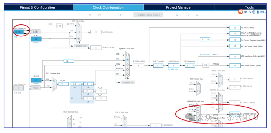 我们使用STM32CubeMx进行初始化配置。下面是系统的时钟树,其中LSE 32768为LPUART提供时钟,让其可以工作于STOP低功耗模式。