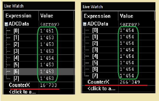 下面截图是关闭过采样和开启过采样获取到的8个ADC结果及所用时间。左边是关闭过采样时的情形,右边是开启过采样时的情形。