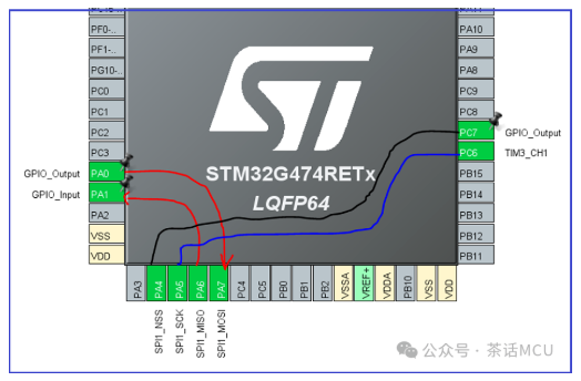 最近不止一个人聊起如何使用GPIO结合DMA模拟串行通信方面的话题,并咨询有无相关参考例程或文档。我这里使用STM32G474芯片的GPIO,结合DMA与TIMER来模拟SPI通信,做下快速演示以供参考。 被模拟出的SPI采用全双工通信方式。被模拟的SPI做主,选择PA0做发送脚,PA1做接收脚,PC7做片选控制脚。时钟使用TIM3 CH1的PWM输出来提供。片内SPI1做从,也工作在全双工模式。