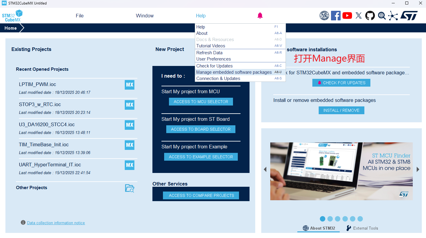 打开CubeMX,选择菜单栏中的Help->Manage embedded software packages。进入包管理界面。