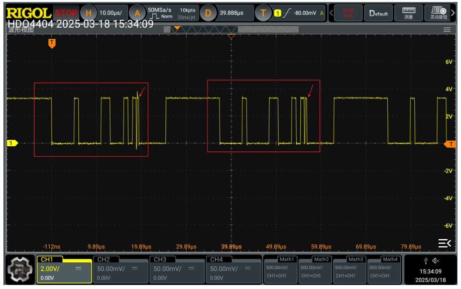 把上图红色箭头部分的波形继续放大,可以看到下面的波形,图中红色箭头指向的为