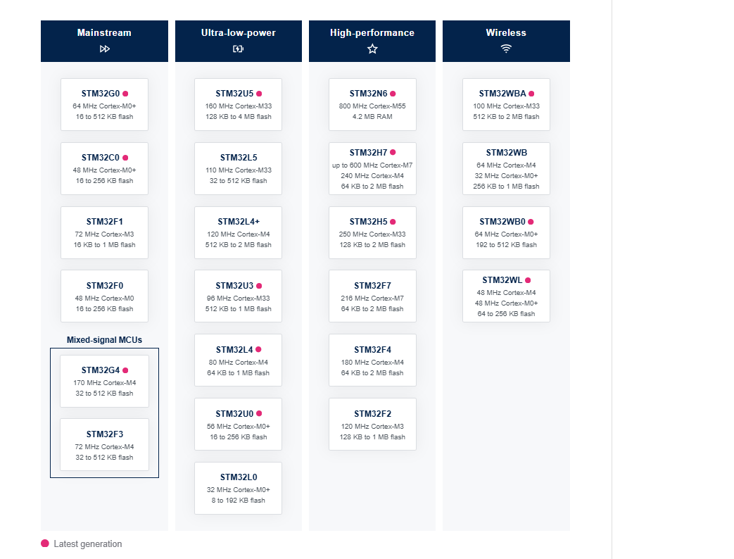 旧版 新版 STM32 产品阵容布局的演进逻辑STM32 产品阵容的持续增长要求官方平台具备更高的信息承载力。由于 STM32 家族每年保持 1 至 3 个新系列的发布频率,旧版横向扩展的方框设计已达物理极限。新的视觉设计遵循 ST 全球 Web 图形准则,引入了符合 Web 无障碍标准(Web Accessibility Norms)的色彩与形状,确保全球开发者均能高效获取信息。 技术参数的语义化呈现在全新的 STM32 视觉交互中,每个产品系列方框均集成了核心技术指标。STM32 系列方框现在直接显示 Flash 起始容量、内核类型(如 Cortex-M4/M7/U5 等)以及工作主频。这种设计减少了工程师在选型初期的点击次数,使技术规格的初步筛选在单一视图内即可完成。 混合信号与车载布局的战略调整针对高性能模拟应用,ST 明确了 STM32G4 和 STM32F3 的市场定位,将其标注为 Mixed-signal MCUs。这一调整有助于工程师在处理电机控制、数字电源等需要高精度 ADC/DAC 和比较器的场景时,快速定位目标型号。同时,为了配合即将推出的 STM32 汽车级 MCU 家族(STM32 Automotive MCUs),新布局在架构上已完成扩展准备,确保汽车电子开发者拥有独立的探索路径。 基于 CoreMark 的性能分级系统为了提供客观的性能参考,新版布局在垂直列中采用了基于 CoreMark 值的排序算法。STM32 各系列按照性能从底部到顶部依次增强,这种垂直滚动(Vertical Scrolling)的交互方式符合现代网页浏览习惯,同时也建立了一套基于行业标准跑分的性能坐标系,方便开发者在同类别中进行纵向对比。 常见问题解答 (FAQ)为什么 ST 更改了 STM32 产品阵容的视觉布局?主要原因是产品线增长过快(每年 1-3 个新系列),旧设计无法承载更多信息。新设计提升了交互性,并为即将到来的车载 MCU 系列预留了空间。 在新布局中如何快速判断 STM32 的性能高低?开发者可以观察垂直列中的位置,系列位置越靠上,其 CoreMark 跑分越高,代表处理能力越强。 在哪里可以查看 STM32 的 RAM 大小?在新版界面中,只需将鼠标悬停在特定系列的方框上,系统会动态显示该系列的 RAM 容量和具体的 CoreMark 数值。 STM32G4 系列在选型指南中属于哪一类?STM32G4 现已被明确归类为“混合信号 MCU(Mixed-signal MCUs)”,位于主流型(Mainstream)分类中,侧重于高精度模拟外设集成。 |