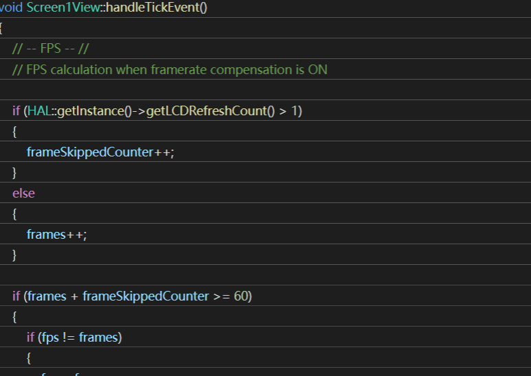2. FPS 计算公式的局限性如果使用上述公式来计算 FPS, 其实是需要满足一定前提条件的。一个是图像的刷新率是 60Hz, 另一个是是否开启帧补偿。 2.1. 刷新率是不是 60Hz上述公式是在刷新率是 60Hz 的情况下计算的,如果 TouchGFX 界面的刷新率不是 60Hz, 那么上述公式计算出来的结果就不准确。 因为 FPS 是指在 1 秒钟时间里传输的图像的帧数量,那么每个 Tick 的周期要保证是 16.667ms, 这样才能使用 if (frames + frameSkippedCounter>= 60) 的判断条件。 TouchGFX 提供的 LTDC 接口的 TBS (TouchGFX Board Setup) 每个 Tick 是 16.667ms, 所以都使用这个公式,如果是自己重新创建的工程,那么就需要注意这点。如果一个 Tick 周期是 33.3ms,1s 是 30 个 tick 周期,那么就需要修改判断条件为 if (frames + frameSkippedCounter >= 30)。 2.2. 帧补偿关闭的情况其次,上述公式只有在 TouchGFX 丢帧补偿使能的情况下才有效。如果 TouchGFX 丢帧补偿处于关闭状态,那么可以用以下公式来计算 FPS。 c 运行