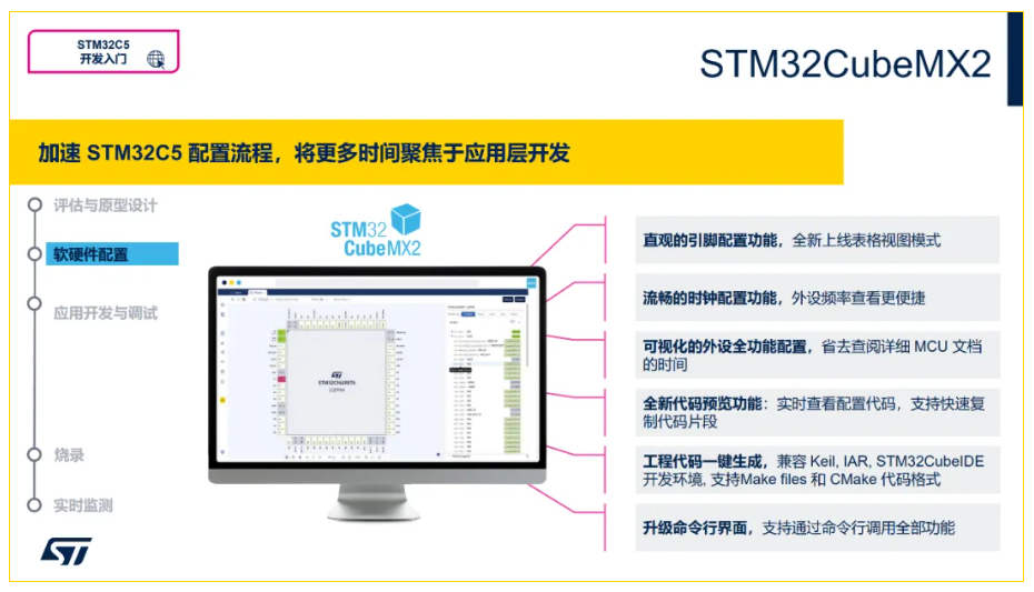 概要介绍 STM32CubeMX2依托成熟的STM32CubeMX深厚基础,全面升级STM32开发体验。它在继承既有成熟稳定功能的同时,新增多项创新特性,自首发版本起,便为用户带来更高效、更灵活、更具创新力的开发体验。