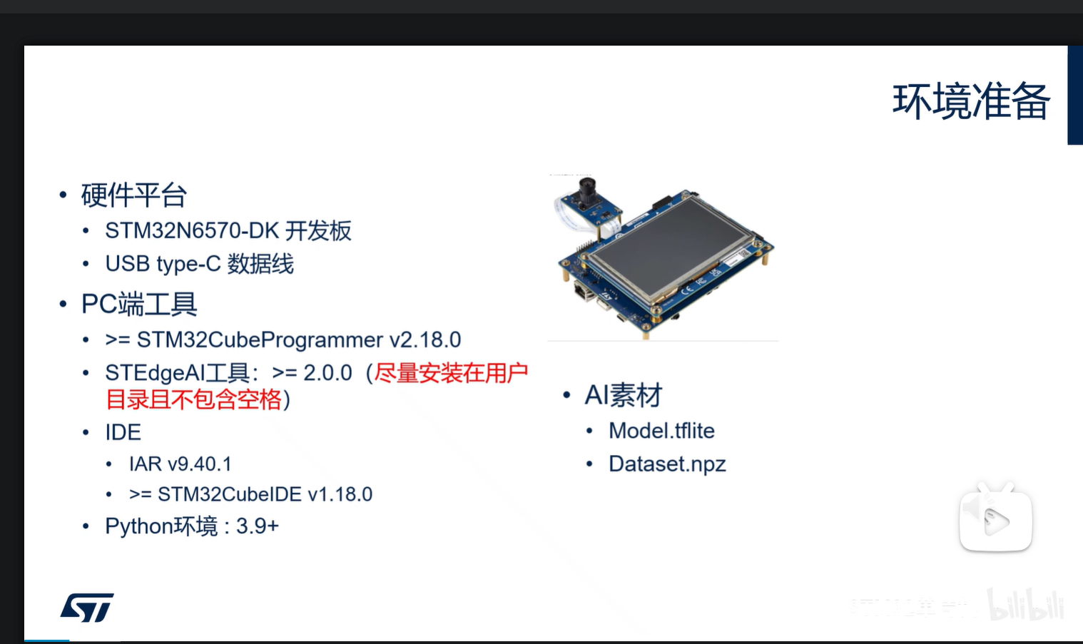 工欲善其事必先利其器 一、环境 ①硬件平台 ------STM32N6570-DK 开发板 ------USB type-C 数据线 ②PC端工具 ----- >= STM32CubeProgrammer v2.18.0 -----STEdgeAI工具:>= 2.0.0(尽量安装在用户目录且不包含空格) -----IDE -----IAR v9.40.1 ----- >= STM32CubeIDE v1.18.0 -----Python环境 : 3.9+ ③AI素材 -----Model.tflite ----- Dataset.npz 二、安装